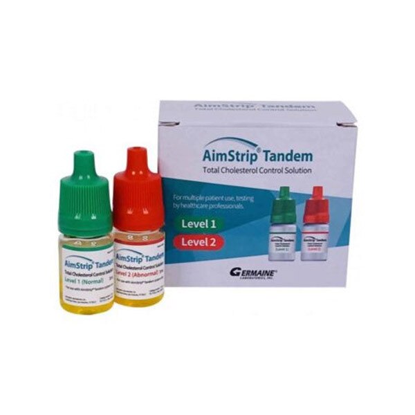 The AimStrip Cholesterol Control Solution is a high-precision tool for measuring cholesterol levels. It is specially designed to detect systematic analytic deviations that may arise from reagent or analytical variation. This solution is for testing purposes only and comes with two 3mL bottles per box.